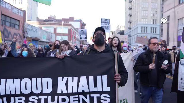 ABD'nin New York kentinde toplanan Filistin yanlısı göstericiler, yeşil kartı iptal edilen eski Columbia Üniversitesi öğrencisi Mahmud Halil'in ICE tarafından gözaltına alınmasını protesto etti.