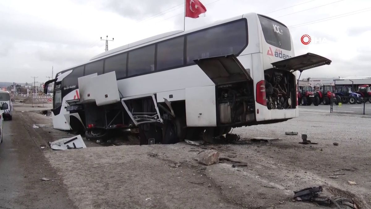 Ankara'da sürücüsünün rahatsızlanması sebebiyle kontrolden çıkan şehirlerarası yolcu otobüsü yol kenarındaki beton bariyere çarptı. Güvenlik kamerasına da yansıyan kazada aralarında şoför ve hostesin de bulunduğu 5'i ağır toplam 16 kişi yaralandı.