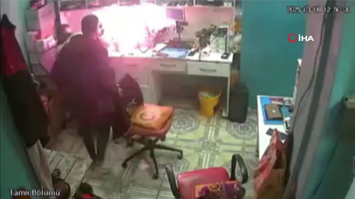 Adana'da bataryası şişen telefon, tamircinin koyduğu yerde patlayarak alev aldı. O anlar ise güvenlik kamerasına yansıdı.