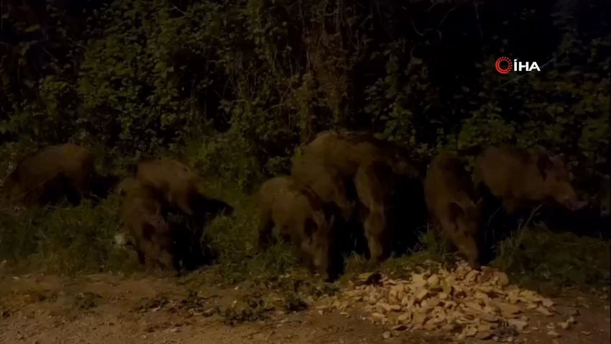 Bursa'da aç kalan domuz sürüsü şehir merkezine inerek bir süre yemek aradı.