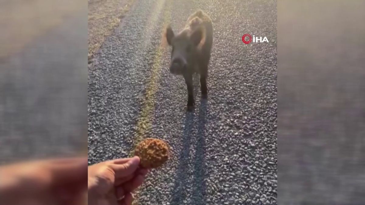 Bursa'da aç kalan domuz sürüsü ilçe merkezine indi. Vatandaşlar domuzları kurabiye ile besledi.
