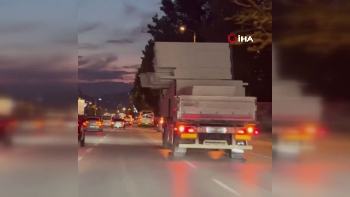 Bursa'da bir tır sürücüsü, açık dorsesine fazla yük alarak kilometrelerce ilerledi. Tehlikeli anlar saniye saniye amatör kameraya yansıdı.