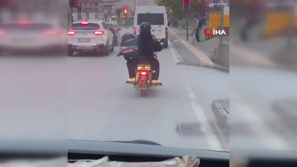 Bursa'da işlek cadde üzerinde ilerleyen motosiklet sürücüsü bebeği pusette taşıdı.
