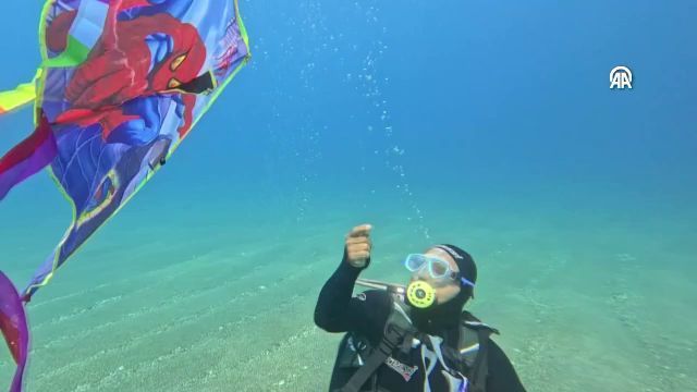 Akdeniz Üniversitesi Su Ürünleri Fakültesi Öğretim Üyesi Prof. Dr. Mehmet Gökoğlu, dalış sırasında su altında bulduğu uçurtmayı akıntıda yüzdürerek çocukluk günlerini yad etti.
