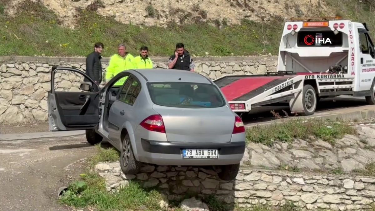 Karabük'de duvarda asılı kalan otomobili alt yola düşmekten polis ekipleri kurtardı.