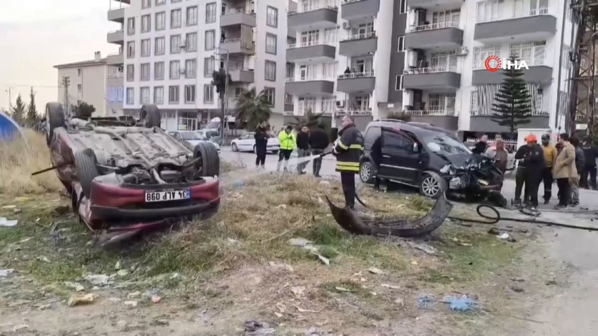 Hatay'da hafif ticari araç ile otomobilin çarpıştığı kazada otomobil ters döndü. Kazada 1'i ağır 3 kişi yaralanırken o anlar saniye saniye kameralara yansıdı.