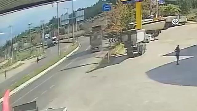 Denizli'nin Buldan ilçesinde karşı şeride geçen tırın başka bir tırla çarpışması güvenlik kamerasınca kaydedildi.