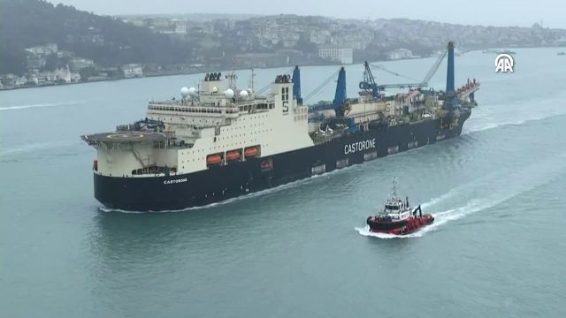 Türkiye'nin Karadeniz'de keşfettiği doğal gaz için boru döşeyecek "Castorone" adlı gemi, İstanbul Boğazı'ndan geçişini tamamladı.