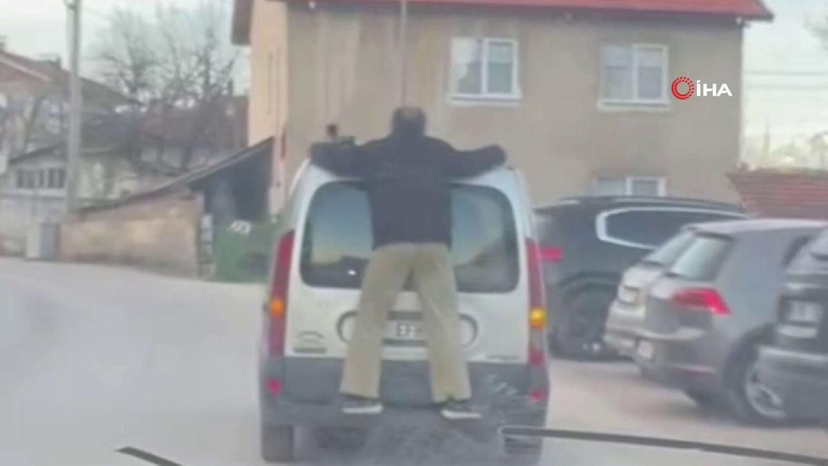 Karabük'te hafif ticari aracın tavan raylarına tutunarak yolculuk yapan kişi görenleri hayretler içerisinde bırakırken, o anlar cep telefonu kamerasıyla görüntülendi.