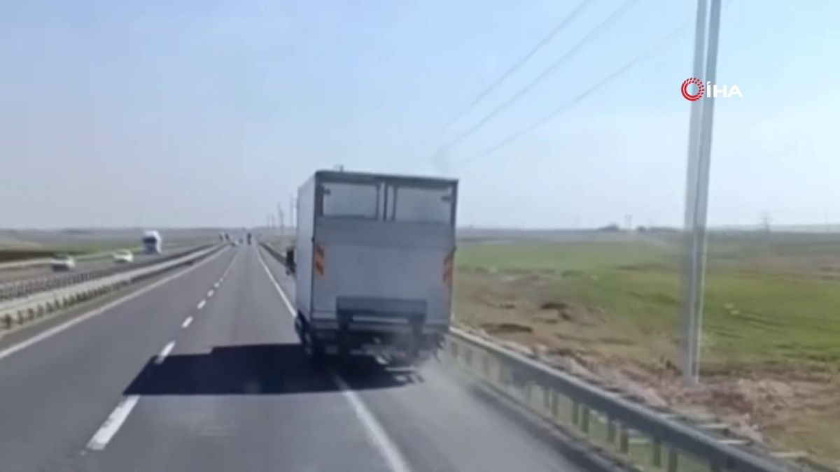 Şanlıurfa'da bir sürücü, önünde ilerleyen ve defalarca bariyerlere çarpma ve şarampole düşme tehlikesi yaşayan kamyonetin sürücüsünün dikkatini korna çalarak çekmeye çalıştı.