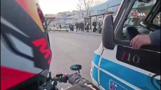 Bursa'da seyir halindeki motosikletli, önüne kırdığını iddia ettiği minibüs şoförüne 'lan' diye hitap edince sürücü adeta deliye döndü. Artan tansiyon sonrası motosikletliye el kaldıran sürücü, daha sonra araçtan inerek tartışmaya devam etti. O anlar kask kamerasına yansırken, deliye dönen sürücü, "Sen bayanın yanında nasıl lan kelimesini kullanıyorsun?" diye tartışırken, kavgayı çevredekiler büyümeden ayırdı.