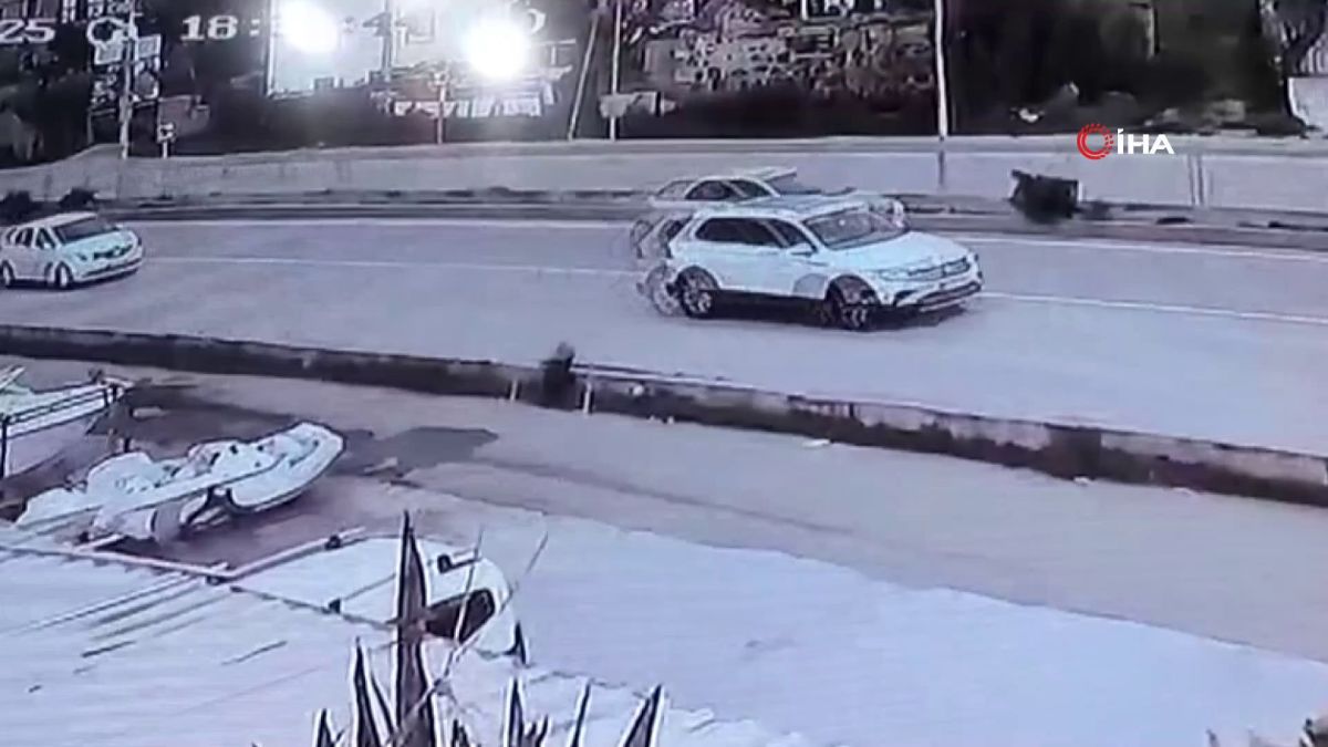 Muğla'da yolda yürürken köpeğin havlamasından irkilen adam panikleyerek yola fırlayınca çöp kamyonunun altında kalarak yaralandı. Meydana gelen kaza güvenlik kameralarına yansıdı.