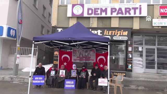 Muş'ta çocukları terör örgütü PKK tarafından kaçırılan aileler, DEM Parti İl Başkanlığı binası önündeki eylemlerinde çocuklarına teslim olmaları çağrısında bulundu.