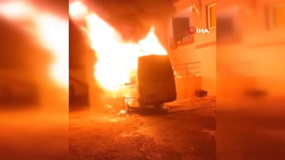Hatay'da park halindeki minibüs, yanarak kullanılmaz hale geldi.