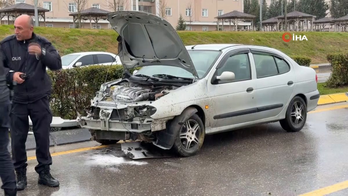 Sakarya'da yağmur sebebiyle kontrolden çıkan otomobil, refüje çarpması neticesine motor kısmında yangın çıktı. Meydana gelen kazada, yaralanan olmazken araçta maddi hasar oluştu.