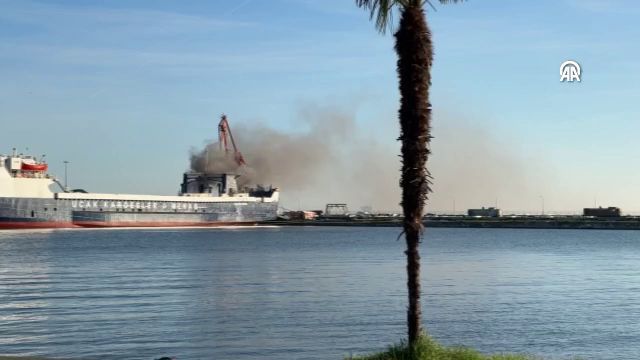 Samsun Limanı'nda bulunan kuru yük gemisinde çıkan yangının söndürülmesi için çalışma yürütülüyor.