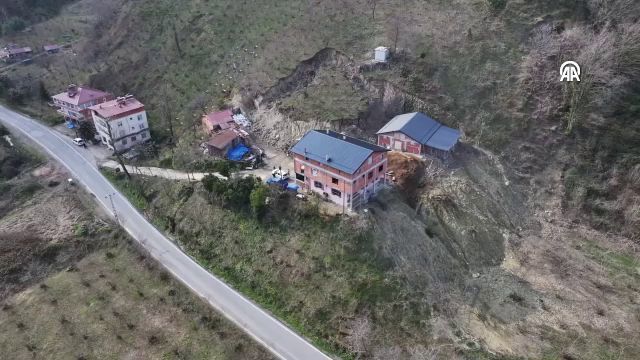 Trabzon'un Arsin ilçesinde istinat duvarının çökmesine ve bir ahırda hasar oluşmasına neden olan heyelan, havadan görüntülendi.