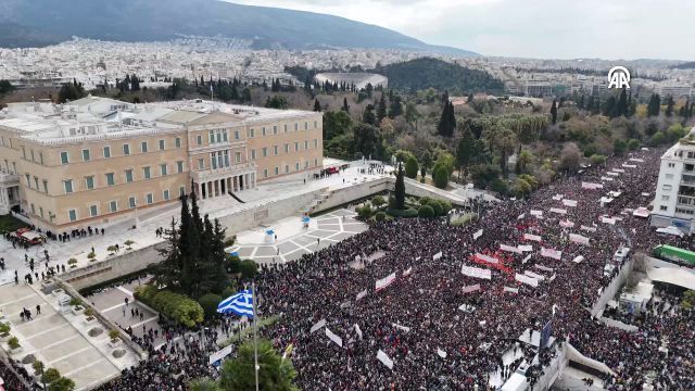 Yunanistan'da 57 kişinin öldüğü tren kazasının ikinci yılında düzenlenen gösteri havadan görüntülendi